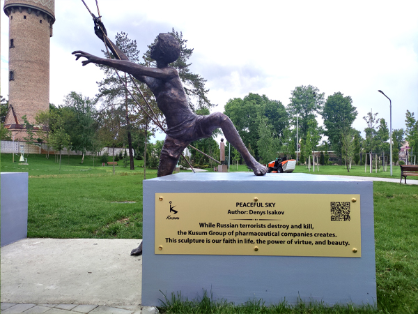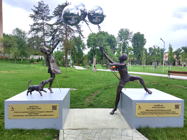 Автор работы — Денис Исаков, заказчик — группа фармацевтических компаний Кусум. Композиция изображает детей с шарами, устремлёнными к небу — как символ надежды, чистоты и мечты о мире. Этот проект стал художественным ответом на войну и разрушения, которые Россия несёт на украинскую землю.