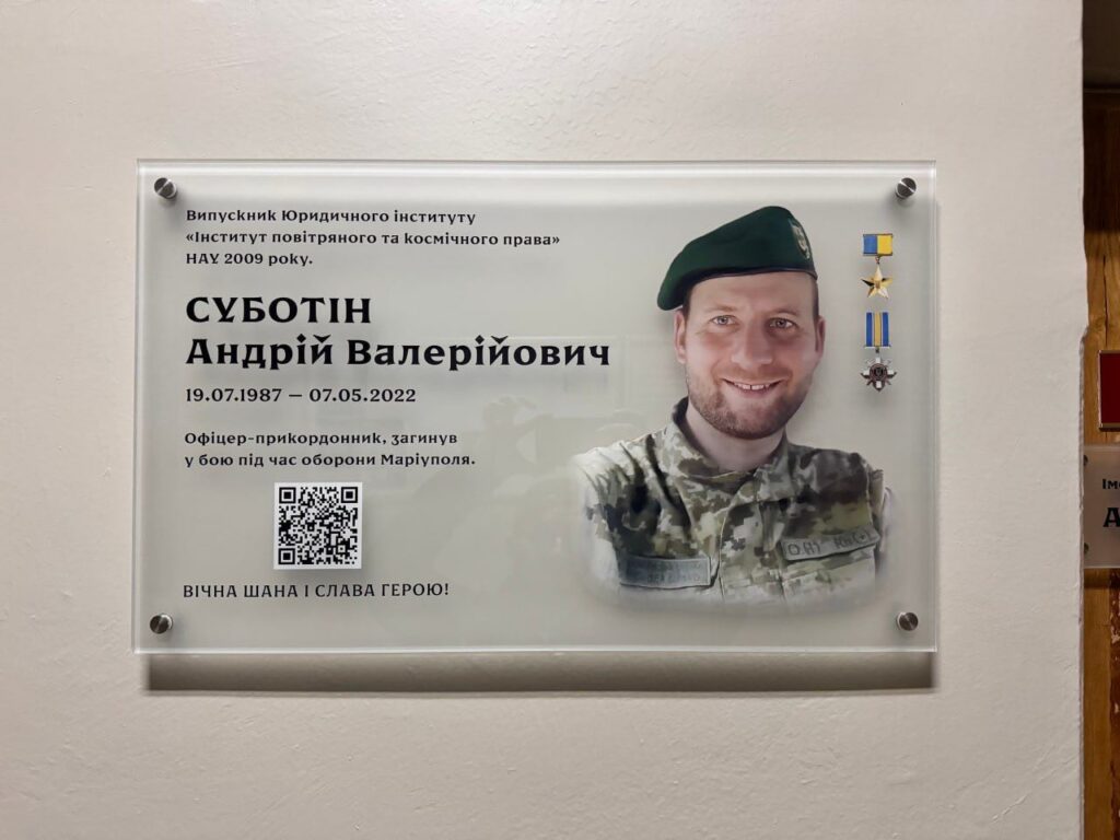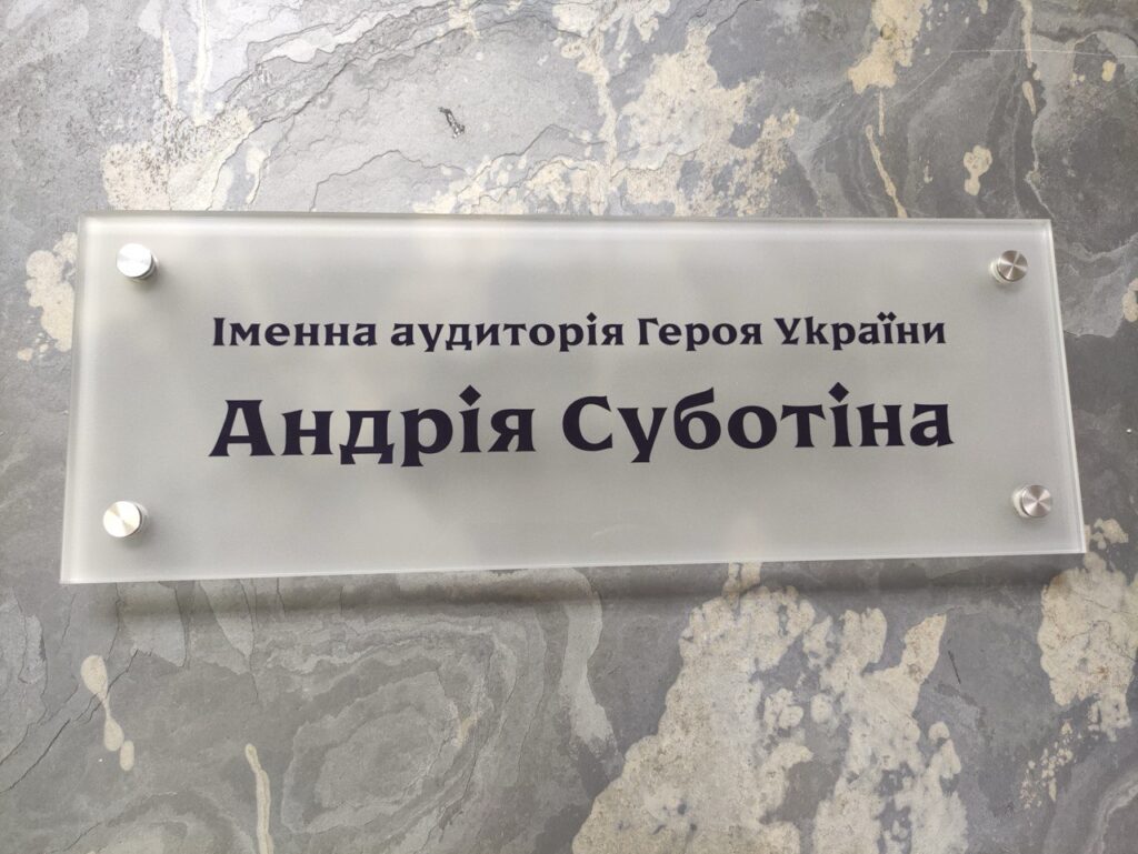 Создание мемориальных изделий — это не просто работа, а важная миссия по увековечиванию памяти тех, кто стал символом мужества, отваги и любви к Родине. Компания «Гудвил Дизайн Сервис» взяла на себя почётную задачу изготовления именной таблички для аудитории, названной в честь Героя Украины Андрея Суботина.