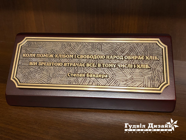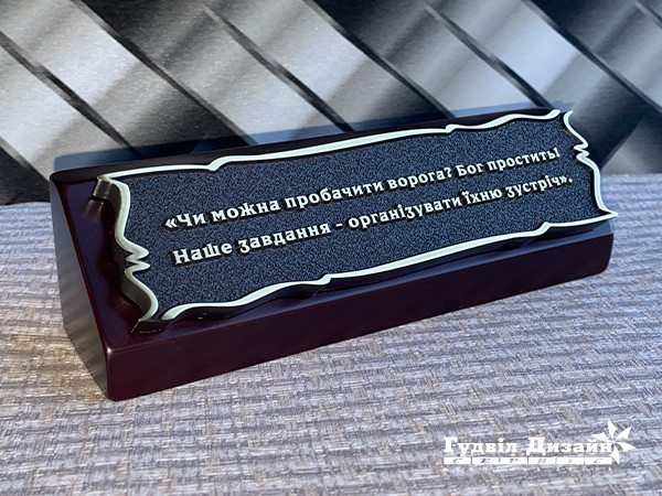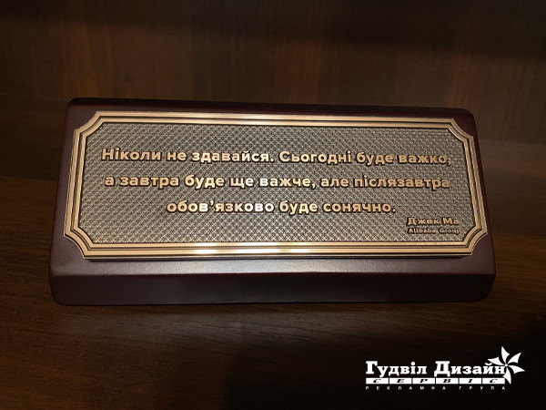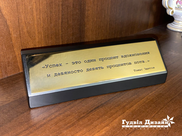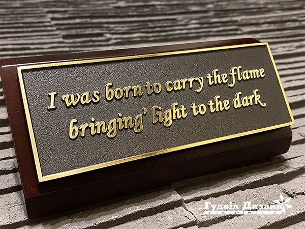 У нас есть решение — это настольная табличка из натурального дерева, качественно обработанного и вскрытого лаком. На деревянной подставке размещается табличка, выполненная из бронзы или латуни, литая, цельнометаллическая с объемными буквами или плоская, с цитатами великих и знаменитых: философов, художников, писателей, политиков, ученых, полководцев, людей чей вклад в развитие человечества неоценим