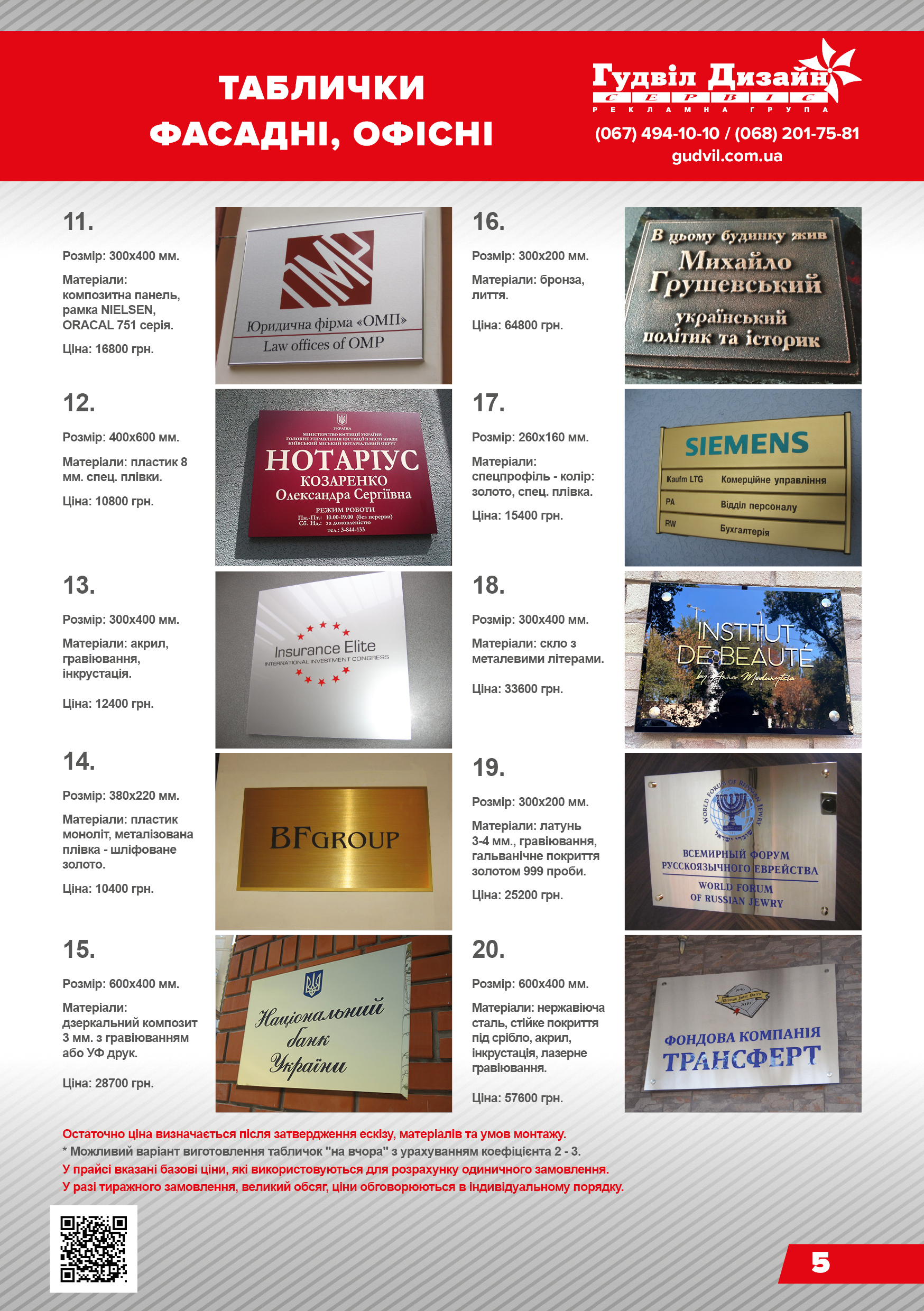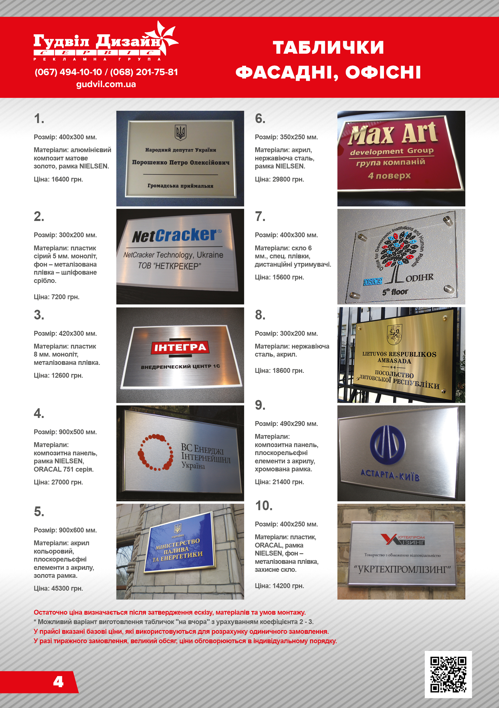 Ми виготовляємо адресні таблички, офісні, інформаційні, фасадні, настільні, кабінетні, з ПВХ, акрилу, композиту, металу.