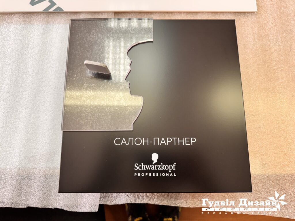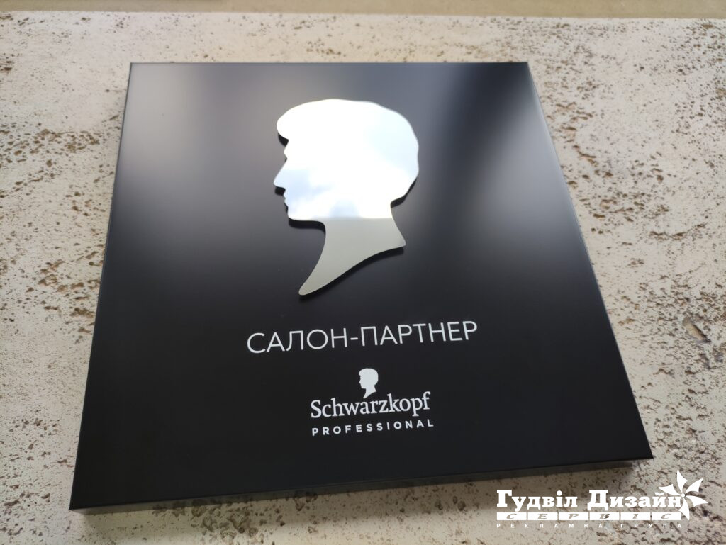 На чорний акрил вручну фіксується логотип Schwarzkopf, вирізаний із дзеркальної нержавіючої сталі.